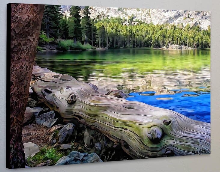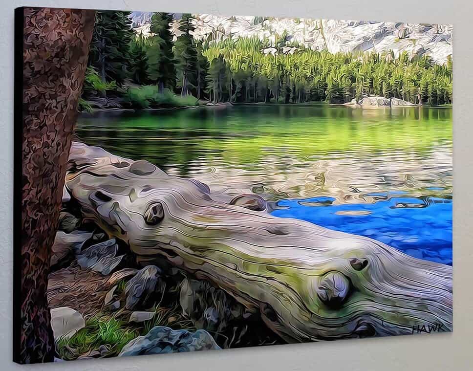 While at Lake George in the Mammoth Lakes Basin. I saw this huge log that looked to me like it was right out of a storybook. I instantly thought that dad would have loved it. Dad was a wood artist and he moved to heaven in August of 2014. I thought I’ve got to include this log in an artwork in honor of Dad. This artwork is the result.