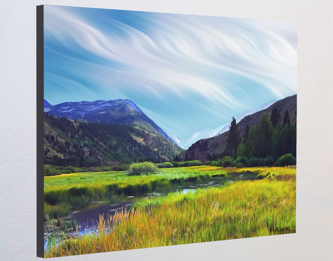 This is Green Creek Meadow by Frank Lee Hawkins. At certain cloudy times, there are shafts of light that interact with the meadow artistically enhancing the scene, ever-changing moment by moment from one type of beauty to the next.