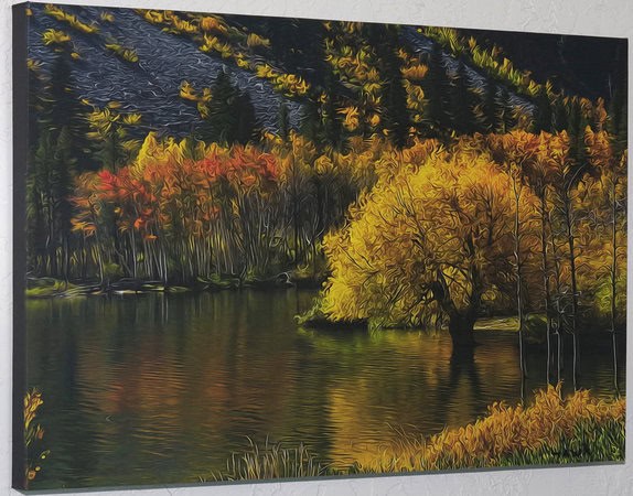 It is another in my series of contemporary landscape art. Please view the close-ups to get a better sense of my art style and to see exactly what you will receive when you purchase this artwork. This artwork is a Limited Edition called “LUNDY LAKE BEAUTY” by FRANK LEE HAWKINS. It is ready to hang and hand signed. There will only be 21 of these produced in this size on canvas.